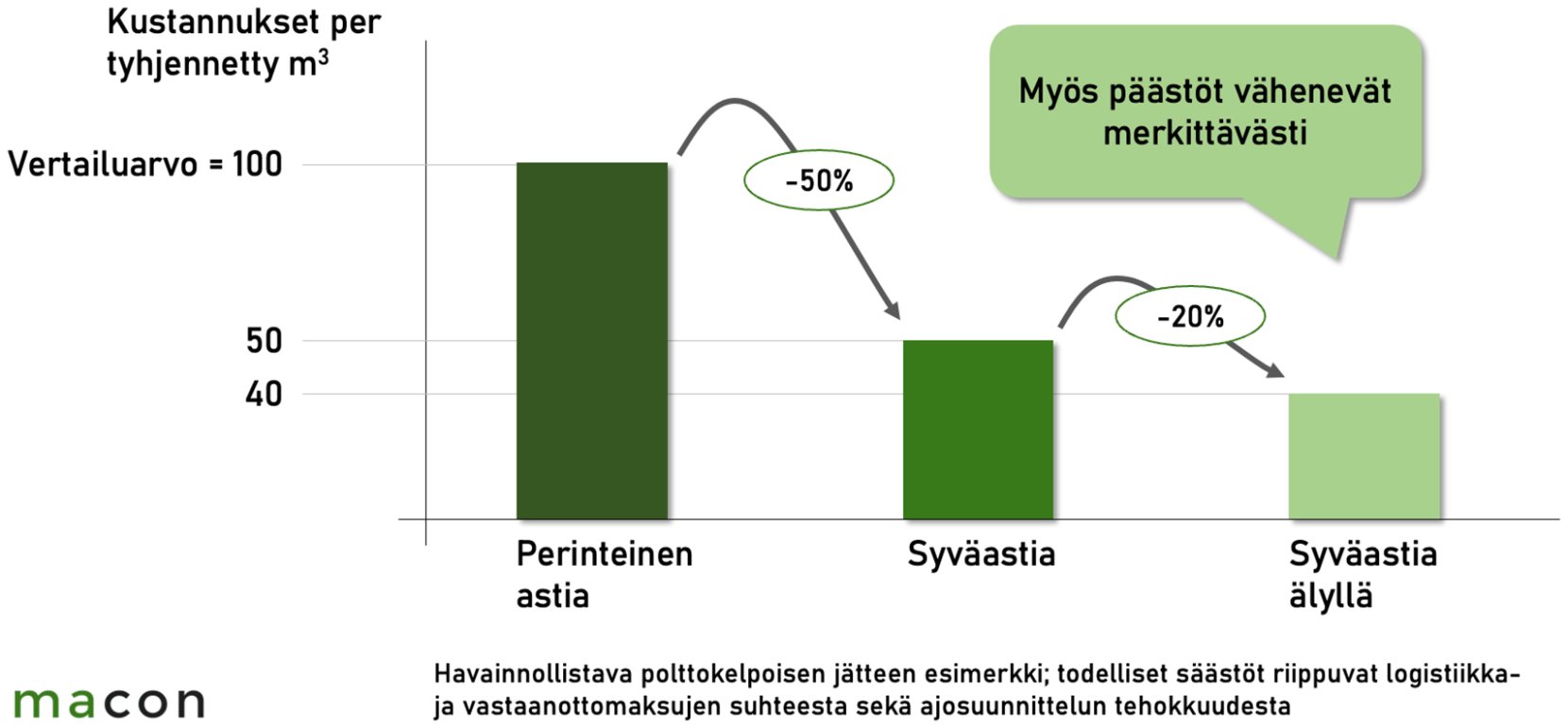 Tasavälityhjennyksessä astian täyttöaste tyhjennyshetkellä on tyypillisesti 40 prosenttia – eli 60 prosenttia tyhjennyksestä on ilmaa. Älykäs jätehuolto, jossa astiat tyhjennetään tarpeen mukaan perustuen anturiin tai mobiilitilaukseen, pystyy kaupunkialueella nostamaan keskimääräisen täyttöasteen tyhjennyshetkellä noin 80 prosenttiin. Ylitäyttötilanteet voidaan välttää kokonaan. Syväastian tapauksessa älyratkaisun suhteellinen vaikutus kokonaishintaan on vähäinen, ja käyttöönottopäätös on helpompi tehdä. Syväastiat ovat yleisempiä suurissa kohteissa. Niissä päätöksentekijät voivat aikaansaada suuren euromääräisen säästön.